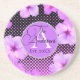 Farbtöne in heißen Rosatönen auf tropischen Hibiskus-Blume auf einem Halfton, Ober, karierte rosa und schwarze Kulisse für Kontrast, wo in der Mitte eine rosa Kugel, wo man es mit einem Buchstaben, Familienname und Jahr personalisiert.