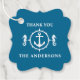 Bevorzugen Sie Tags, Dankeschön Tags mit Ihrem Familiennamen oder anderen personalisierten Texten, mit einem benutzerdefinierten nautischen Bootanker und Seepferd in Weiß auf Aquablau oder ändern Sie die Hintergrundfarbe, wenn nötig. Ideal für Party, Kunsthandwerk, Events und vieles mehr.