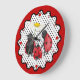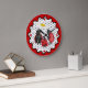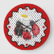 Niedliche, skurrile Kunst mit Mama, Papa und Baby Ladybug für einen Spaziergang im Garten. Frau Ladybug hat einen Dissy-Blume-Schirm. Roter Rand mit scharfen Kanten. Größere rote Punkte zeigen Positionen von 12, 3, 6 und 9. Kleinere rote Punkte geben die anderen Stunden an einem Tag an.