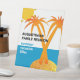 Wiedersehen Summer Vacation Pedestal Sign, mit individualisierbarem Familiennamen und Palmen. Das Design zeigt Sonne, Palmen, blauen Horizont und goldenen Glitzer Strand mit kühlem Typografie. Stellen Sie einfach den Namen auf der Vorderseite und die Details der Veranstaltung ein. Genießen Sie Ihre Sommerveranstaltung mit diesem Podestschild. Erhalten Sie passende Geschenke für die ganze Familie, um Ihre nächste Wiedersehen zu einer Zeit zu machen, an die Sie sich erinnern können.
