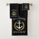 Personalisieren Sie Ihre Zuhause mit einem eleganten nautischen Badetuch-Set, das Ihren Familiennamen, Ihr Strandhaus, Ihre Kabine oder einen anderen Wunschtext anzeigt. Dieses individuelle Design besticht durch einen Vintagen Bootsanker, goldfarbene Lorbeerauslehre-Blätter mit Sternemblem auf einem schwarzen Hintergrund. Die Rückseite des Handtuch-Set ist weiß, und Sie können die Primärfarbe der Vorderseite leicht an Ihre aktuelle Dekoration oder Ihr aktuelles Thema anpassen.