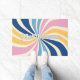 With a retro twist, personalize your doormat with a 70s inspired, colorful sunburst. The family name or other custom text is in layers, with the top layer being outlined text. The sunburst features pink, creme, yellow, light blue, and blue colors.