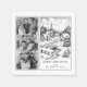 Thèse elegant black-and-white Christmas napkins feature a beautifully illustrated winter village, evoking the quiet charm of a storybook scene. Delicate linework captures snow-covered rooftops, pine trees, and a winding stream beneath a stone bridge, all bathed in a soft, vintage glow. A slender church steeple watches over cozy cottages, while distant mountains fade into a dreamy horizon. The design is airy and serene, inviting warmth and nostalgia. Below the illustration, you can personalize the “Merry Christmas” message and sender names. On the left, add three family photos, automatically filtered in black and white to match the theme.