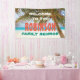Family Wiedersehen Willkommen Banner mit tropischem Strandhintergrund mit einer aufsteigenden Palme, Sand und aqua blauen Ozean. Sie können alle Texte einschließlich des Familiennamen bearbeiten. Ideal für eine Wiedersehen am Strand oder für ein Lau- oder Tiki-Fest. Die Hintergrundkunst wird aus einem künstlerisch gerenderten Foto gemacht, das mehr wie ein Gemälde aussieht.