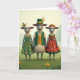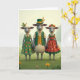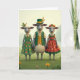 This card shows three dressed-up sheep standing close together in a sunlit green meadow, their bodies turned forward like they’ve paused for a friendly portrait 💚. In the middle is a proud ram in a forest-green waistcoat with shiny gold buttons over a cream shirt, topped with a dark hat wrapped with a gold band and a few wheat stalks. To his left, a ewe in an emerald dress covered with small orange-and-yellow daisy shapes leans in slightly, her white collar adding a gentle, affectionate touch. To his right, another ewe wears a terracotta-red dress patterned with white-and-gold floral bursts, and a red cap finished with a bright yellow flower, as if she dressed to impress someone special. Their wide, expressive eyes meet the viewer directly, and the way the two ewes flank the ram suggests an easy closeness, like friends posing with an inside joke. Near the top, a short St. Patrick’s Day greeting sits centered in green lettering, with a smaller line beneath it in a lighter green shade ☘️. Behind them, the background fades into soft pale-green foliage and a light sky, while tiny yellow and pink wildflowers dot the grass at their feet.