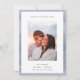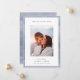 Chic minimalistische Verlobung-Anzeigenkarten verfügen über ein vertikal oder portrait orientiertes Foto auf weißem Hintergrund mit einem dünnen, wasserfarbigen Streifen in ätherischen Farbtönen staubblauer Farbe. "Forever Starts Here" erscheint oben in der modernen Schrift mit Ihrer Ankündigung, Namen und weiteren Details am unteren Rand.