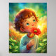 Auf dem Bild hält ein fröhliches Kind sanft eine kräftige rote Blume, nah zur Nase. Mit einem hellen Lächeln auf dem Gesicht schließt das Kind seine Augen und genießt den süßen Duft. Die Sonne scheint, strahlt ein warmes Licht auf die Szene, und der Hintergrund ist voll von weichen, verschwommenen Grüntönen und Farben, die die Schönheit des Augenblicks unterstreichen. Der Ausdruck des Kindes strahlt reine Freude und Neugier aus und erfasst den einfachen Genuss, die Natur zu erleben.