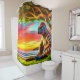 Dieser Duschvorhang hat ein Fantasiewesen darauf.