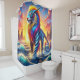 Dieser Duschvorhang hat ein Fantasiewesen darauf.