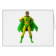 Illustration eines fantastischen Superhero kleidete im gelben und grünen Kostüm mit dem Kap an, das mit den Händen auf angesagtem stehend ist