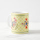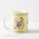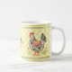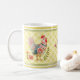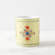 Hellgelbe und grüne Hühner-Tasse mit kariertem Hintergrund und Blumenzentrum.