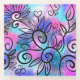 Ein lustiger kleiner Vogel in der oberen links Ecke und Blumenelemente auf einem rosa, lila und türkisfarbenen Hintergrund.