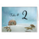 Die Zeltkarte der Hochzeitsempfehlung mit einer Tischnummer von etherisch aussehendem Sandstrand mit Muscheln. Schwarzer Text auf der Vorder- und Rückseite ist für jeden Tisch am Empfang personalisiert. Schöne Ergänzung zu einem Strand Thema Hochzeit.
