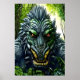 Grosses Fantasiebeast mit beängstigenden Augen und scharfen Zähnen im Wald. Das ist eine künstlerische KI.