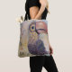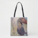 Ein farbenfroher Toukan mit einem großen Schnabel wird vor einem sanften Hintergrund mit zarten Blume dargestellt. Es scheint mit seinen Federn in einer strukturierten Art und Weise überzogen, was dem Vogel eine lebendige und lebendige Präsenz verleiht. Naturpals in Print — GardenGoonies — Fantasy-Bird-Tasche aus originaler Acrylkunst — Lächeln nach dem anderen