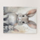 Puzzle aus zwei zauberhaften Kaninchen, einem großen und einem kleinen, sitzend Seite an Seite mit fröhlichen Ausdrücken inmitten eines weichen, natürlichen Hintergrunds. Die sanften Farben und das zarte Laub um sie herum schaffen eine ruhige und herzliche Szene.