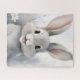 Das Puzzle eines niedlichen, flauschigen, grauen Kaninchens mit großen Ohren und einem zauberhaften Ausdruck ist umgeben von zarten weißen Blume. Die sanften Pastelltöne schaffen eine sanfte und skurrile Atmosphäre.