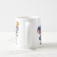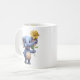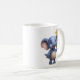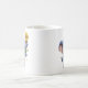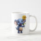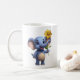 Tasse mit einem niedlichen Cartoon Elefanten stehend, mit einer großen gelben Blume mit seinem Kofferraum. Der spielerische Charakter hat große blaue Augen und einen fröhlichen Ausdruck.