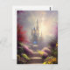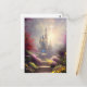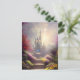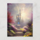 Auf der bezaubernden Postkarte finden Sie die Fantasy-Szene des sonnenbeleuchteten Schlosses und die wunderschönen Gartentreppen mit vielen Blume und Sträuchern. Digitales Kunstwerk mit AI Rendering Software erstellt.