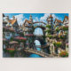 Eine wunderschöne und fantastische Stadt aus weißen Häusern, die in farbenfrohen Blume auf einer Strandklippe versteckt und durch Brücken verbunden sind, macht ein lustiges Puzzle.