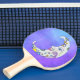 Dieses Tischtennispaddel hat einen fantasievollen Halbmond mit abstrakten Markierungen in blau, gelb und lila auf einem lila Himmelshintergrund mit weißen Sternen.