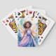 Kartenspielen mit einer fröhlichen Kinderfee mit bunten Schmetterlingsflügeln, stehend in einem fließenden lila Kleid, umgeben von Schmetterlingen und sanften, traumhaften Farben. Die Szene vermittelt ein Gefühl von Laune und Magie in einem lebendigen, naturlich inspirierten Rahmen.