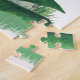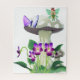 Puzzle einer kleinen Fee mit grünen Flügeln auf einem großen, gepunkteten Pilz, begleitet von einem lila Schmetterling. Unterhalb blüht eine lebhafte violette Blüte und üppige grüne Blätter verleihen der Kulisse eine ganz besondere Note.