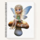 Notebook mit einer charmanten Fee mit zarten Flügeln und goldenen Haaren auf einem großen, gepunkteten Pilz sitzend. Sie trägt ein grünes Kleid und goldene Schuhe, die eine magische und skurrile Aura ausstrahlen.