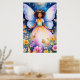 Poster eines jungen Mädchens mit Schmetterlingsflügeln, stehend in einem lebendigen Garten, umgeben von bunten Blume und leuchtenden Sternen. Ihr Kleid ist farbenfroh, und sie trägt eine Krone Blume in ihrem lockigen Haar.