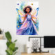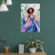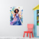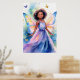 Poster eines fröhlichen Kindes mit bunten Schmetterlingsflügeln, stehend in einem fließenden lila Kleid, umgeben von Schmetterlingen und sanften, traumhaften Farben. Die Szene vermittelt ein Gefühl von Laune und Magie in einem lebendigen, naturlich inspirierten Rahmen.