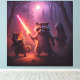 A whimsical fantasy scene set in a dark forest featuring a confident raccoon with a glowing pink and yellow saber, a cautious black cat with a dark sword, and a hooded owl holding a mysterious weapon. Bathed in moonlight with red-eyed intensity and dramatic purples and reds, this playful, cartoonish design blends adventure, sci-fi, and fantasy for imaginative animal art lovers.
