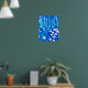 Poster in einer halbabstrakten Illustration eines Fantasy-Waldes mit Blume, Blättern, Bäumen und Vögeln, in Kobaltblau und Weiß