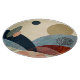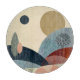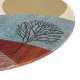 Eine abstrakte Landschaft mit sanften, strukturierten Hügeln mit Bäumen und Pflanze in kühnen Farbtönen Rot, Orange, Beige, Grün und Bräune.
