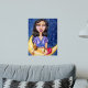 Dieses Kunstposter hat ein Fantasiebild einer hübschen dunkelhaarigen Dame in einem lila Nachthemd, der einen schlafenden gelben Halbmond mit einem Gesicht und rosa Lippen unter einem tiefblauen Nachthimmel mit weißen Sternen hält.
