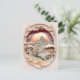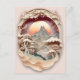 Eine wunderschöne Postkarte mit einer gerahmten Ausschnitt-Szene, die eine untergehende Sonne, Berge, Bäume und alte Architektur darstellt.