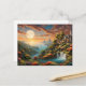 A full moon rises as the sun sets over a fantastic landscape on this post card. A manor house on a cliff above a beautiful waterfall that pours into a river that flows into a sea, as trees and flowers bloom all around.