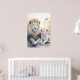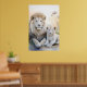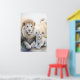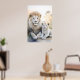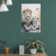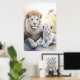 Poster eines majestätischen, erwachsenen Löwen und einer bezaubernden Keule, die in einem ruhigen, pastellfarbenen Ambiente mit zarten Blume im Hintergrund eng zusammensitzen. Ihr weiches, weißes Fell und ihre ruhigen Ausdrücke vermitteln ein Gefühl von Wärme und familiärer Bindung.