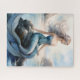 Jigsaw Puzzle einer ruhigen Meerjungfrau mit langen fließenden Haaren, die anmutig auf einem Felsen sitzen, umgeben von ruhigen Meeresgewässern und entfernten Klippen. Weiche Pastellfarben verstärken die ruhige und magische Atmosphäre der Szene.