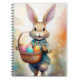 6,5 x 8,75 Notebook mit einem fröhlichen Kaninchen in einem blauen Outfit mit einem Korb gefüllt mit farbenfrohen, dekorierten Eiern. Der Hintergrund zeichnet sich durch sanfte Blumendetails und sanfte, warme Farben aus.