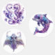 Fantasy Ocean Animals. Illustrationen von Meerestieren, darunter Seepferde, Delfine und Stechrochen, mit lila und blauen Blumendesigns in Fantasiekunst-Stil verziert