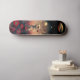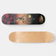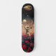 Cyber Fantasy Art Skateboard. Ein surreales digitales Kunstwerk, das eine Roboterkatze mit humanen Merkmalen darstellt und im Vordergrund des Weltraums über roten und rosa Blume schwebt. Über ihnen ist ein anderer Planet sichtbar durch dünne Wolken, während zwei kleine fliegende Untertassen treiben. Der Hintergrund umfasst dunkle Himmel, die Kontrast zwischen Licht und Schatten schaffen.