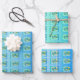 Dieses Set von Packpapier Blatt haben ein wiederholtes Bild eines Fantasiedrachen Seepferd mit Hörnern, blau und grün mit seinem Schwanz in Algen in einem grünen bis blauen Rahmen mit schwimmenden Wasserblasen verpackt. Die drei Bettwäsche sind in verschiedenen Farbtönen und in lebhaften Blau- und Grüntönen gehalten.