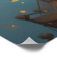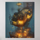Das Fantasy Art Poster bietet einen Luftblick auf eine scheinbar schwimmende futuristische Steampunk Stadt mit gelben Fenstern in mehrstöckigen Gebäude.
