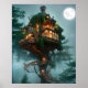 Ein schönes vertikales Poster, das mit AI-Rendering-Software erstellt wurde, bietet ein mystisches, magisches, fantasy-treehouse an einer mondbeleuchteten Nacht.