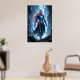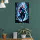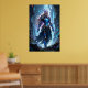 A fantasy warrior woman with long blonde hair, adorned in intricate blue and gold armor, stands in a canyon of futuristic, glowing buildings. Clear details and vibrant colors enhance visual appeal.