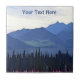 Blaue Berge, blaues Wasser am See, dunkelgrüne Bäume, rosa Kaminfeuer und bewölkt. Eine Darstellung des Sommers im äußersten Norden. Moskitos sind nicht inbegriffen. Passen Sie Ihren eigenen Text an.