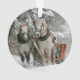 Altes, altmodisches, rotes WinterSchlittenbild, das durch den Schnee in einem Wald von schneebedeckten Bäumen von zwei weißen Zugpferden gezogen wird.