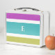 Eine stilvolle Metal Lunch Box mit einem auffälligen Farbblock-Design auf der Vorderseite, in magentafarbenem Rosa, Blau, Grün und Weiß. Auf der Rückseite sind die gleichen Farben in schmaleren Streifen dargestellt. Personalisieren Sie mit Ihrem Initial, das als Monogramm in der Mitte des Designs auf der Vorderseite erscheint. Ein stilvolles und modernes Zubehör für Arbeit, Schule, Freizeit und Reisen.