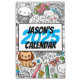 Ein individualisierbares Kinderkalender-Cover-Design mit einem whimsical doodle-Hintergrund voller charmanter Tiere, Regenbögen, Blume und spielerischen Objekten wie farbigen Stiften und Schmetterlingen. In der Mitte wird der Text "Jason's Calendar" in einem fett formatierten Panel angezeigt, das für jeden Namen leicht personalisierbar ist. Der Kunststil ist fröhlich und einladend, perfekt für ein junges Publikum.