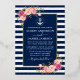 Moderne elegante Aquarellfarbe Rosa Blütenblüte Blumenkohl Ankerhochzeit Einladung beinhaltet rosa Rosen und botanisches Grün. Weißer Anker mit goldenem Foil Ring um ihn herum. Navy Blue Background. Blaue und weiße Streifen. Goldfolie.
